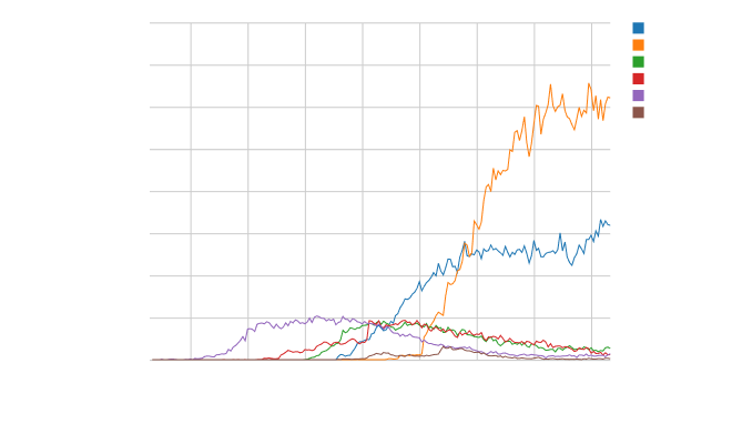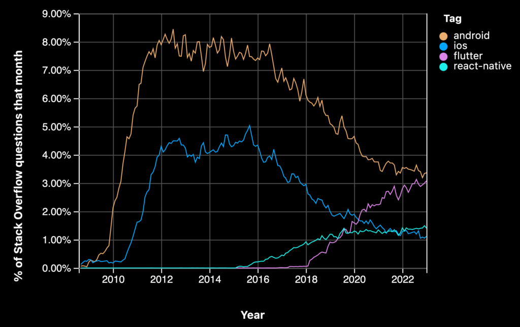 Many cross-platform solutions exist, so why do we focus on React Native and Flutter? The graph below illustrates the number of open threads on StackOverflow in these languages. It’s clear that both Flutter and React Native have seen an upturn in popularity in the last few years, with Flutter taking the lead as the most popular technology on this portal.