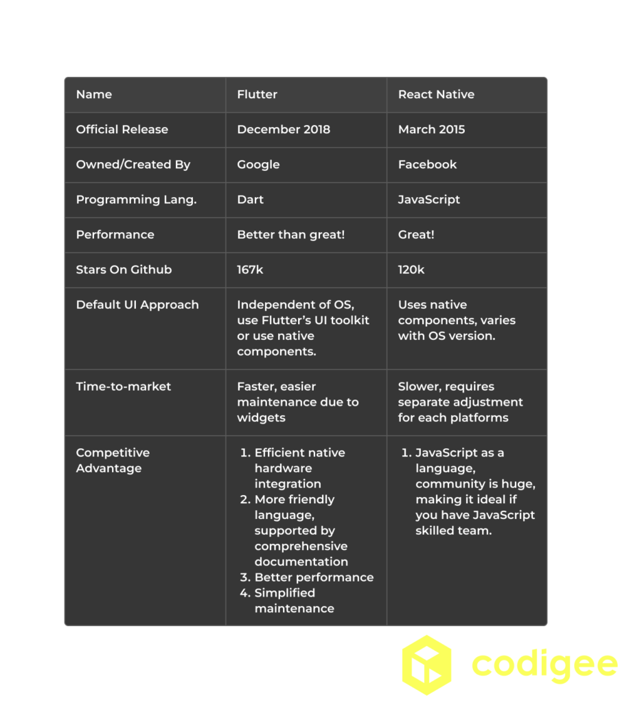 Native technologies resemble dinosaurs—no one wants to waste their budget developing outdated and inefficient languages. Nowadays, it’s much simpler to choose the right cross-platform solution for your project. React Native and Flutter are two of the most popular platforms available, so let’s explore what makes each unique and understand why Flutter and React Native are the best options for your budget and development needs. At first, React Native is not native!