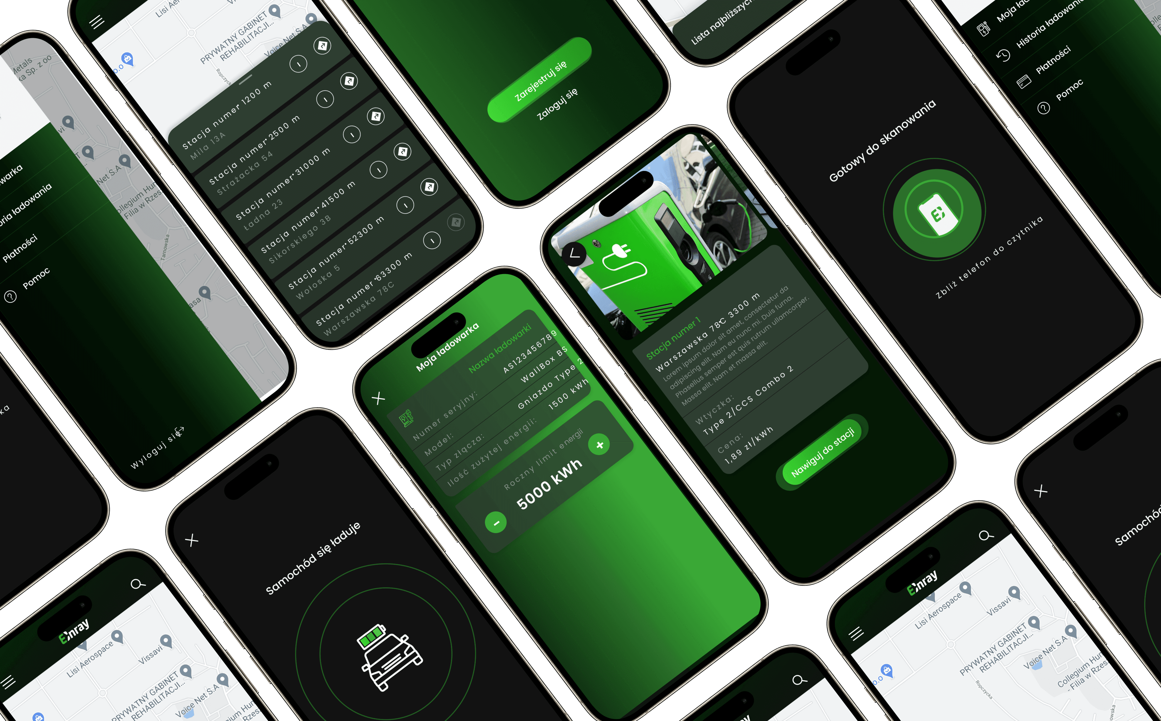 Enray, a mobile app developed using Flutter, connects electric vehicles with solar-powered charging stations in Poland. The app features: