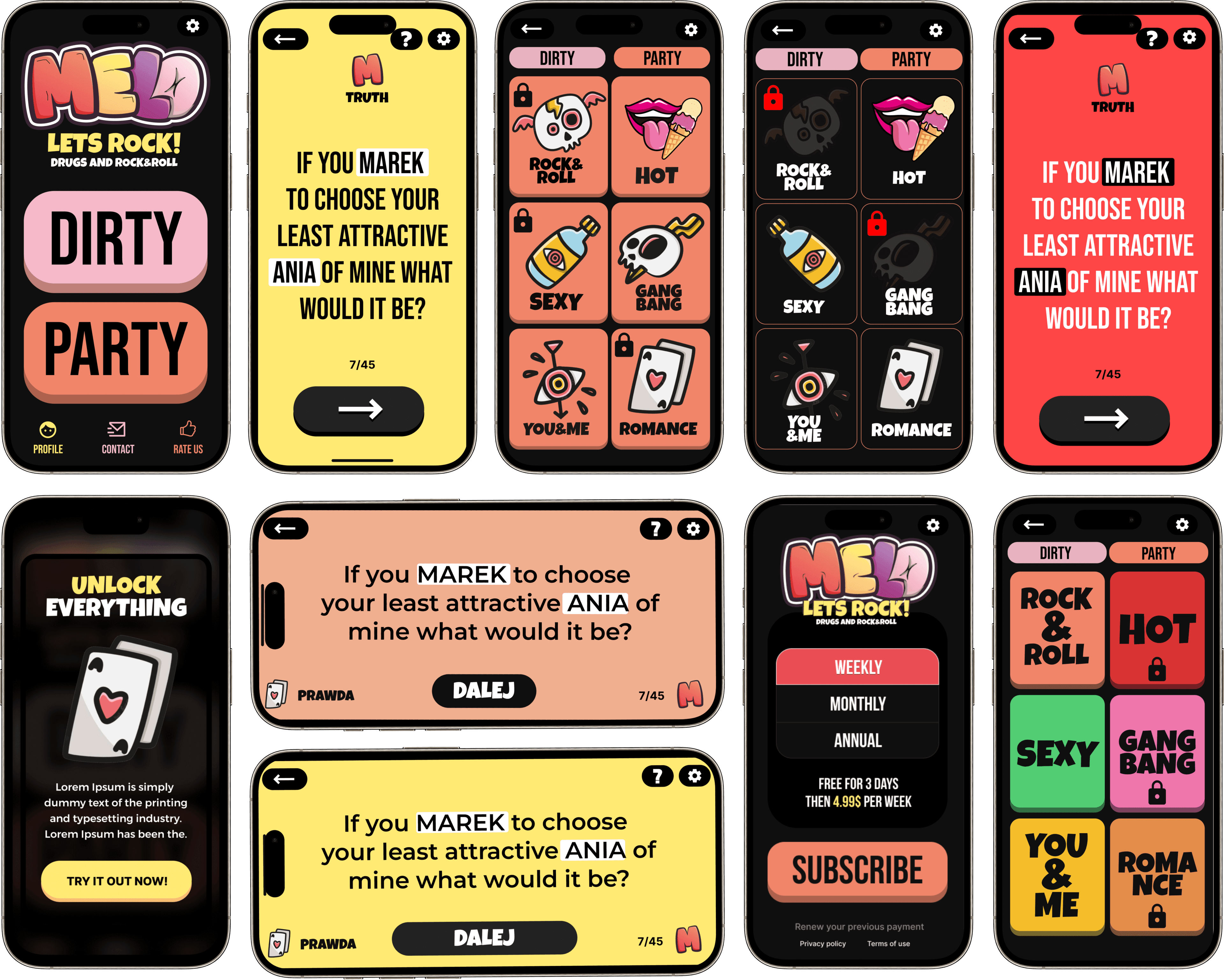 Melo is a party game that boosts every social gathering and event. It helps people easily break the ice and get to know each other while adding a lot of humor to every occasion. The tasks are highly creative and of top quality, suitable for any event, and the mechanics are simple and easy to understand.